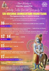 Gangtok, Sikkim – August 11 2025 – ISKCON Gangtok will celebrate Sri Krishna Janmashtami with a week-long festival from August 12–17, 2025, featuring spiritual discourses, cultural performances, and grand festivities.